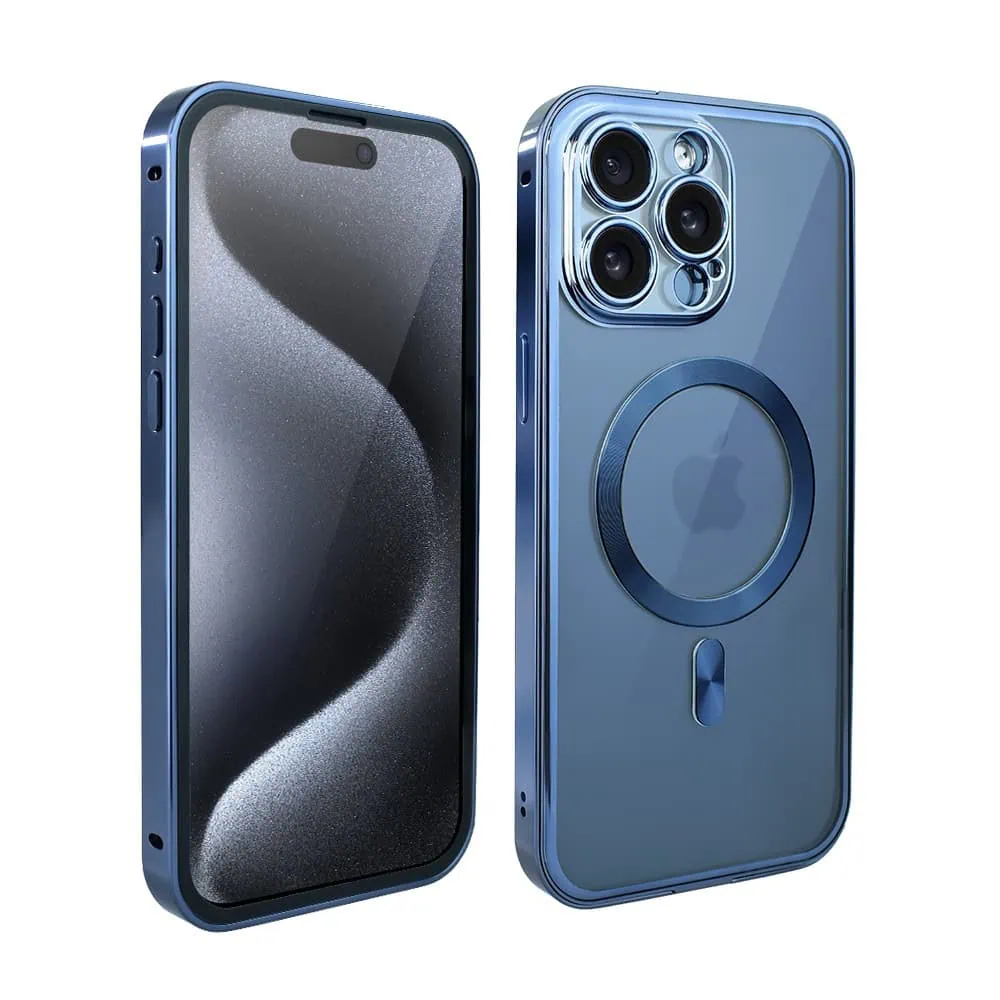 Obudowa do iPhone 15 Pro Max podwójna szyba i aluminium 360° przód + tył magnetyczna, z Magsafe i osłoną aparatu, niebieska