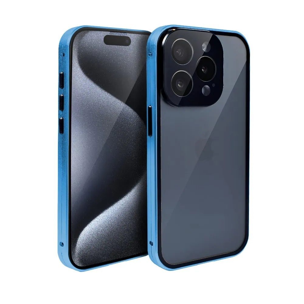 Obudowa do iPhone 15 Pro Max, podwójna szyba i aluminium 360° przód + tył magnetyczna, z osłoną aparatu, niebieska