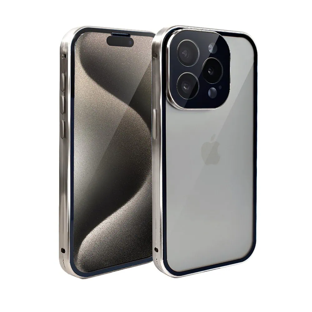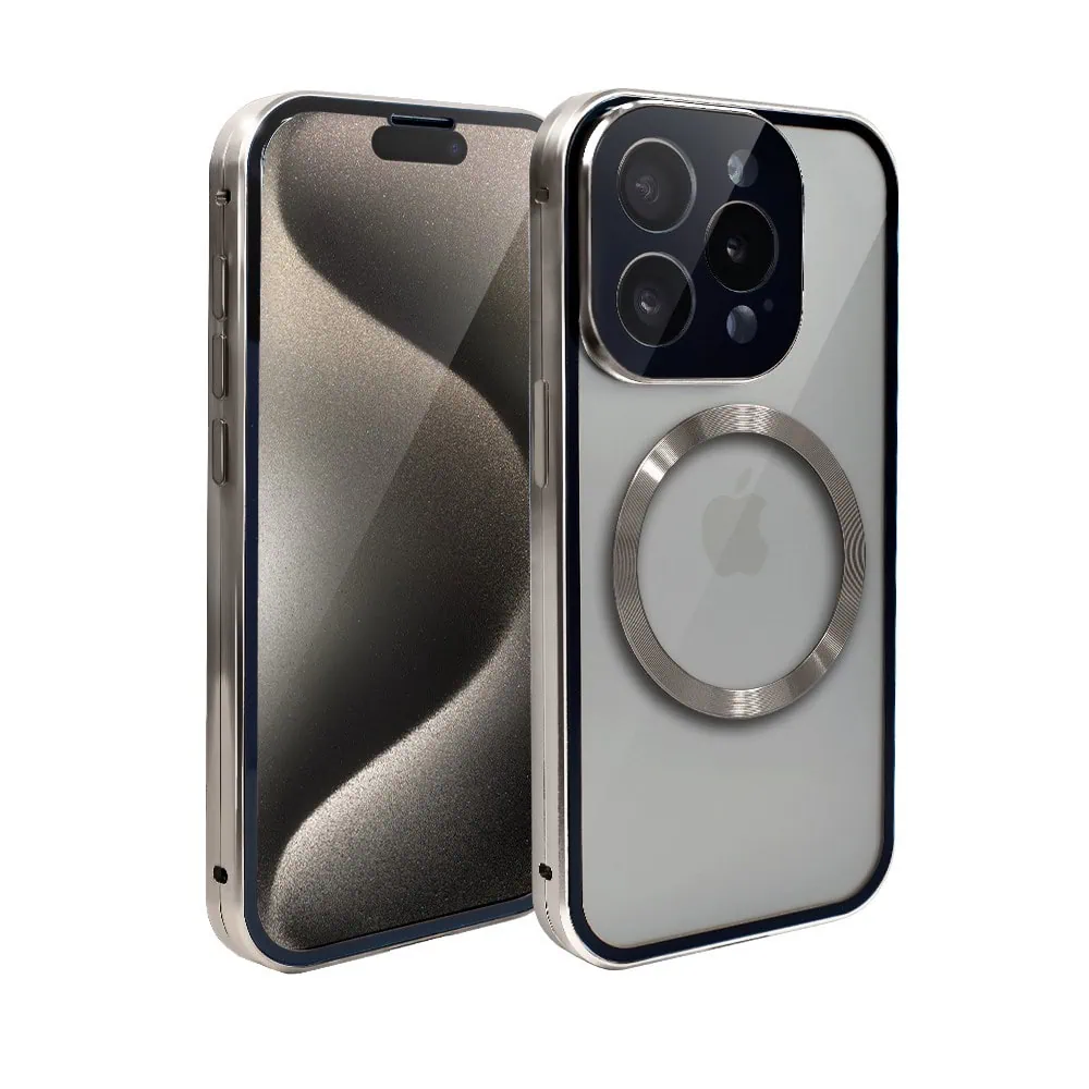 Obudowa do iPhone 15 Pro Max podwójna szyba i aluminium 360° przód + tył magnetyczna, z osłoną aparatu, srebrna