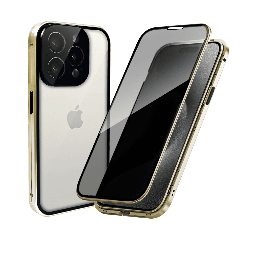 Obudowa do iPhone 15 Pro Max, podwójna szyba i aluminium 360° przód + tył magnetyczna, z osłoną aparatu i szkłem prywatyzującym, złota