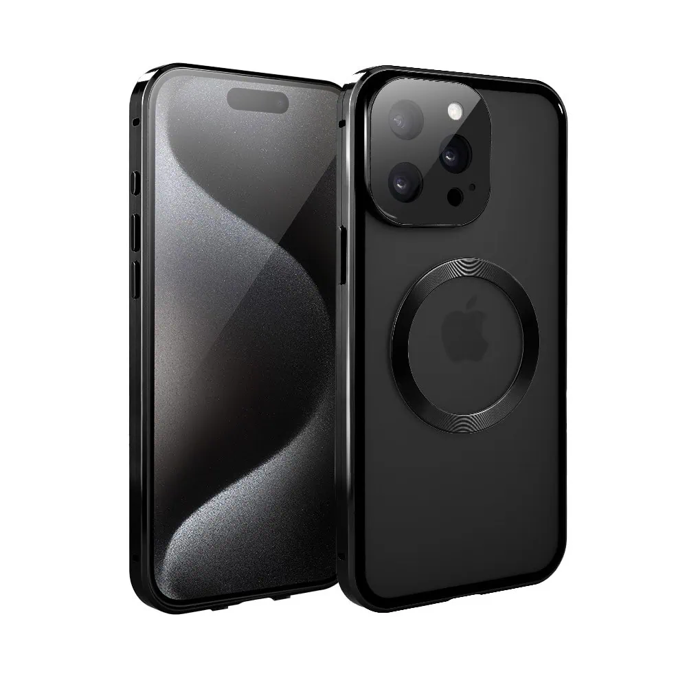 Obudowa do iPhone 15 Pro podwójna szyba i aluminium 360° przód + tył magnetyczna, matowy tył, z MagSafe i osłoną aparatu, czarna