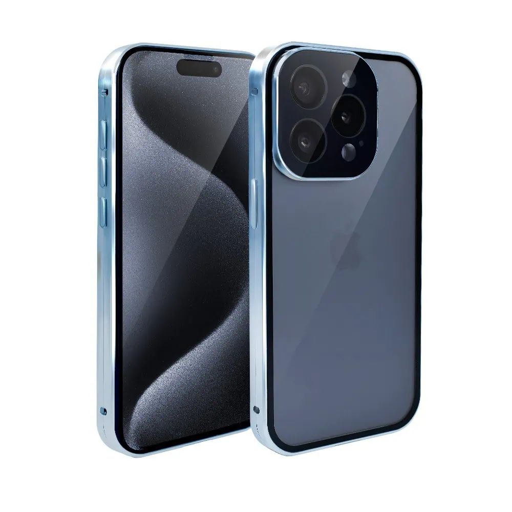 Obudowa do iPhone 15 Pro podwójna szyba i polerowane aluminium 360° magnetyczna, z osłoną aparatu, niebieska