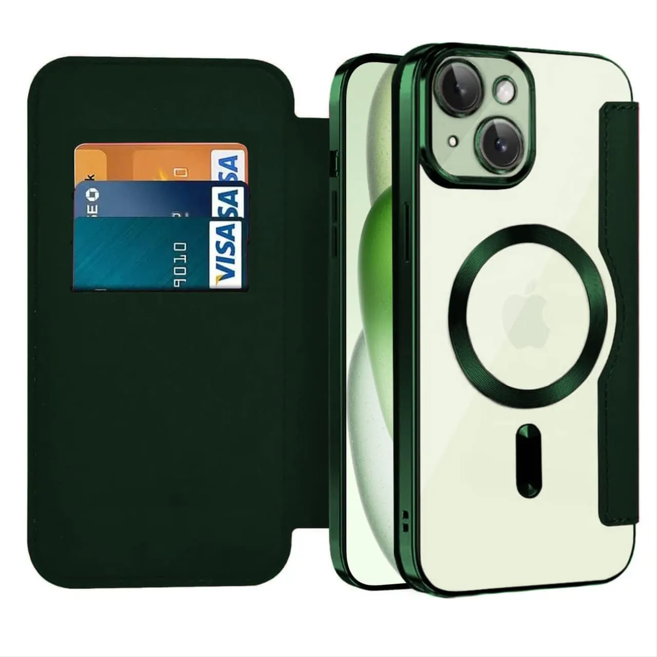 Etui do iPhone 15 typu książka Book Magsafe Lens Protect, z klapką, zielone