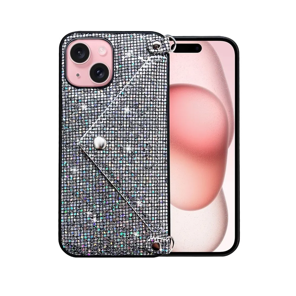 Etui do iPhone 15, eleganckie, błyszczące, torebka z łańcuszkiem, srebrne