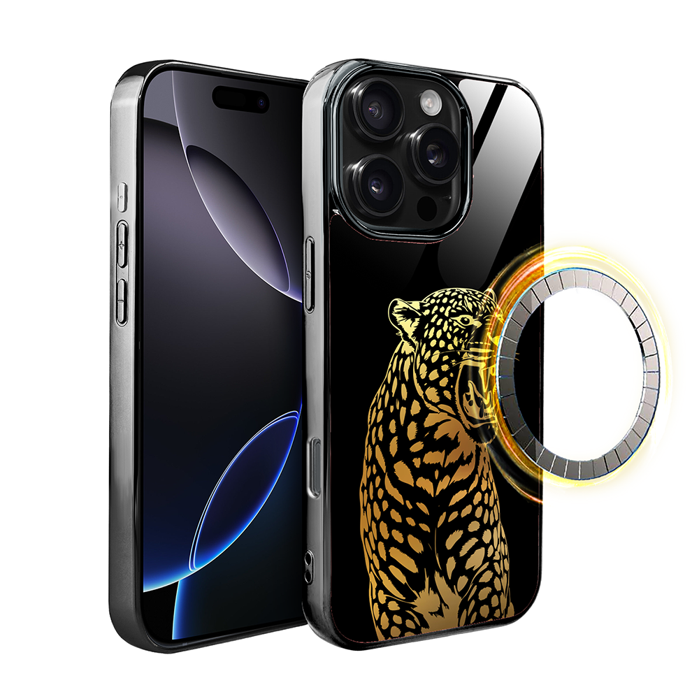 Etui do iPhone 16 Pro, Elite Glass z MagSafe, szklany tył, Golden Midnight, Ryczący Jaguar, czarne