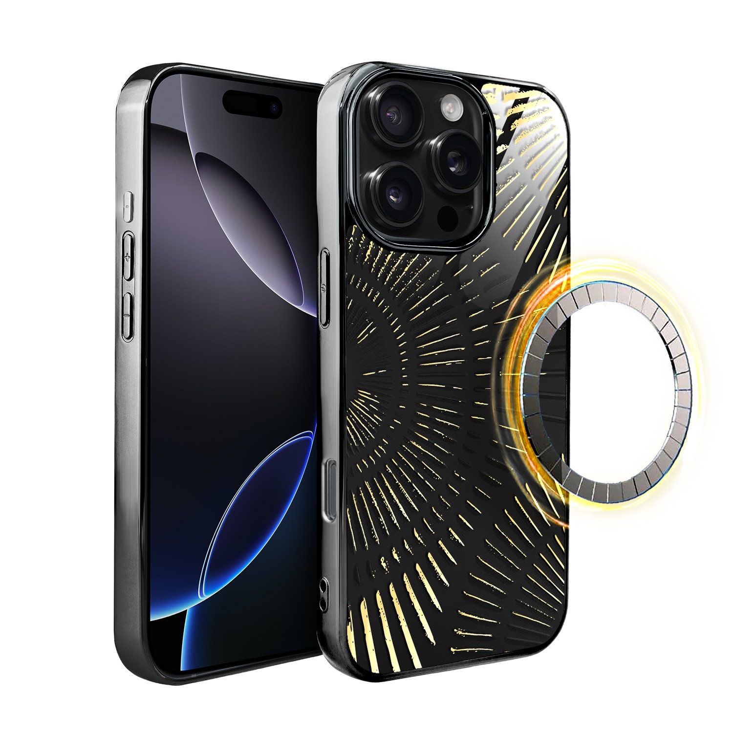 Etui do iPhone 16 Pro, Elite Glass z MagSafe, szklany tył, Mistyczne wzory, Boski promień czarne, złote