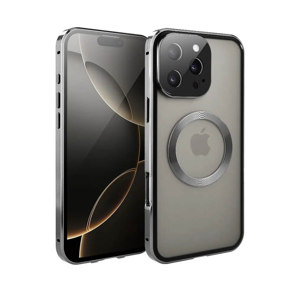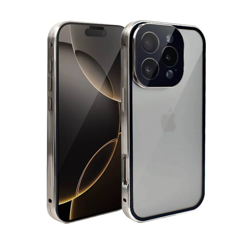 Obudowa do iPhone 16 Pro podwójna szyba i polerowane aluminium 360° magnetyczna, z osłoną aparatu, tytanowa