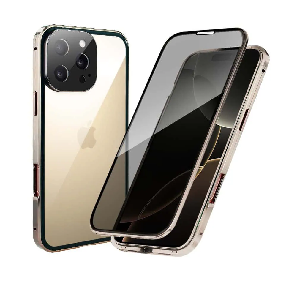 Obudowa do iPhone 16 Pro, podwójna szyba i aluminium 360° przód + tył magnetyczna, z osłoną aparatu i szkłem prywatyzującym, złota