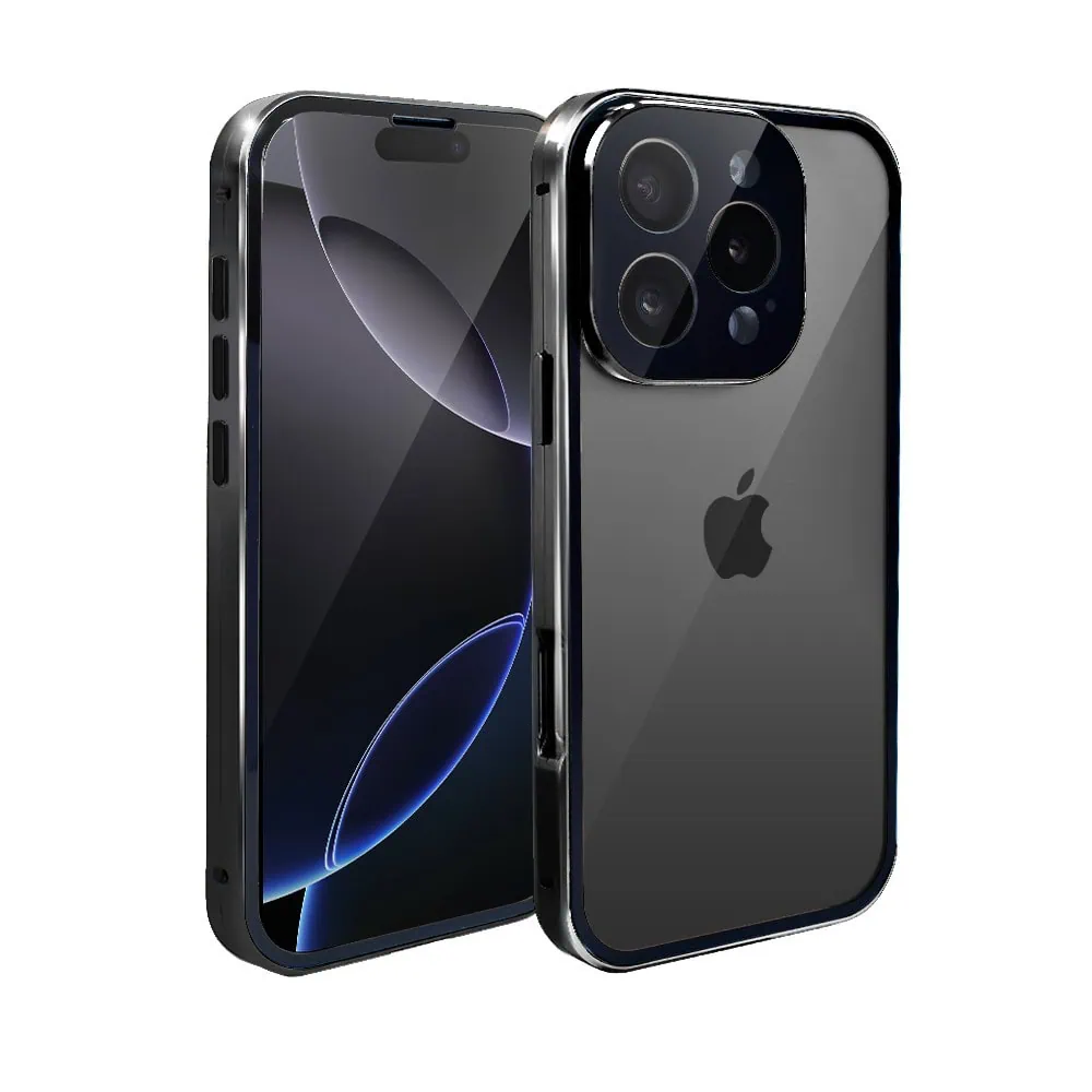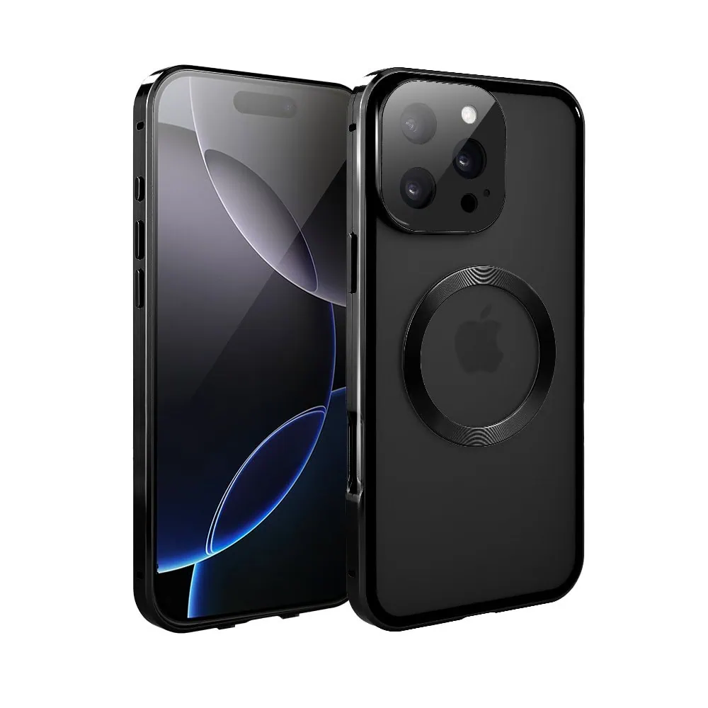 Obudowa do iPhone 16 Pro podwójna szyba i polerowane aluminium 360° magnetyczna, z osłoną aparatu, czarna