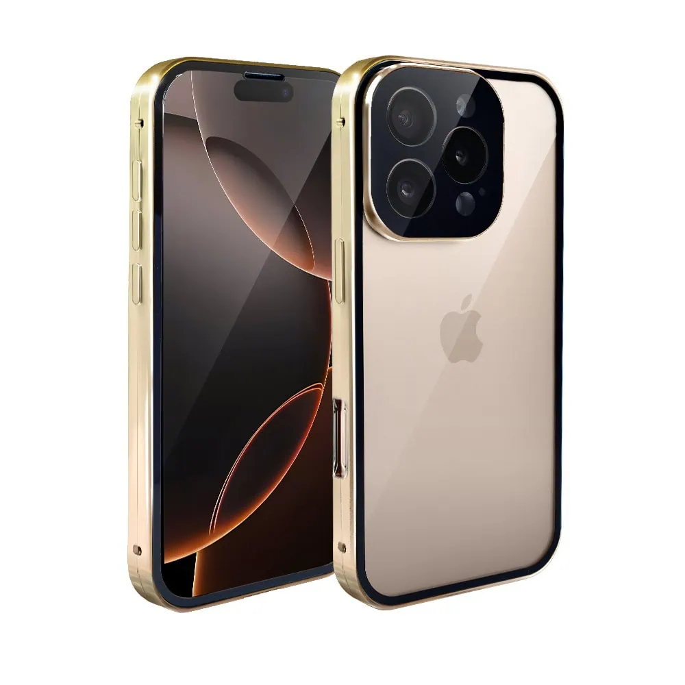 Obudowa do iPhone 16 Pro podwójna szyba i polerowane aluminium 360° magnetyczna, z osłoną aparatu, złota