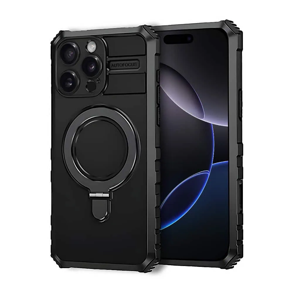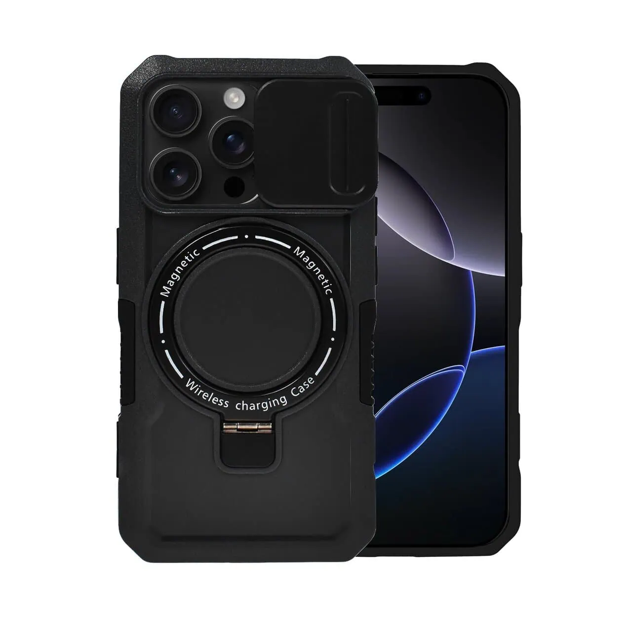Etui do iPhone 16 Pro, pancerne, z osłoną aparatu i metalową podstawką MagSafe, czarne