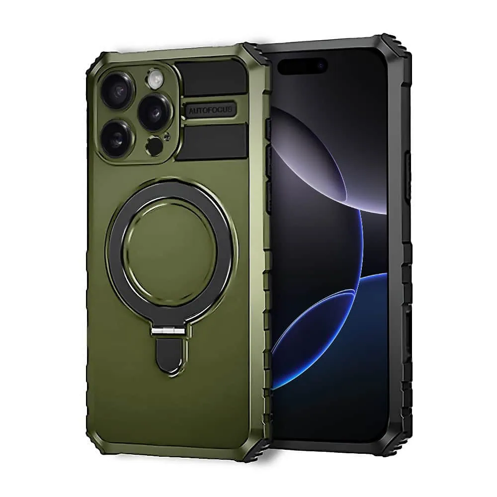 Etui do iPhone 16 Pro, pancerne, z osłoną aparatu i metalową podstawką MagSafe, wojskowa zieleń