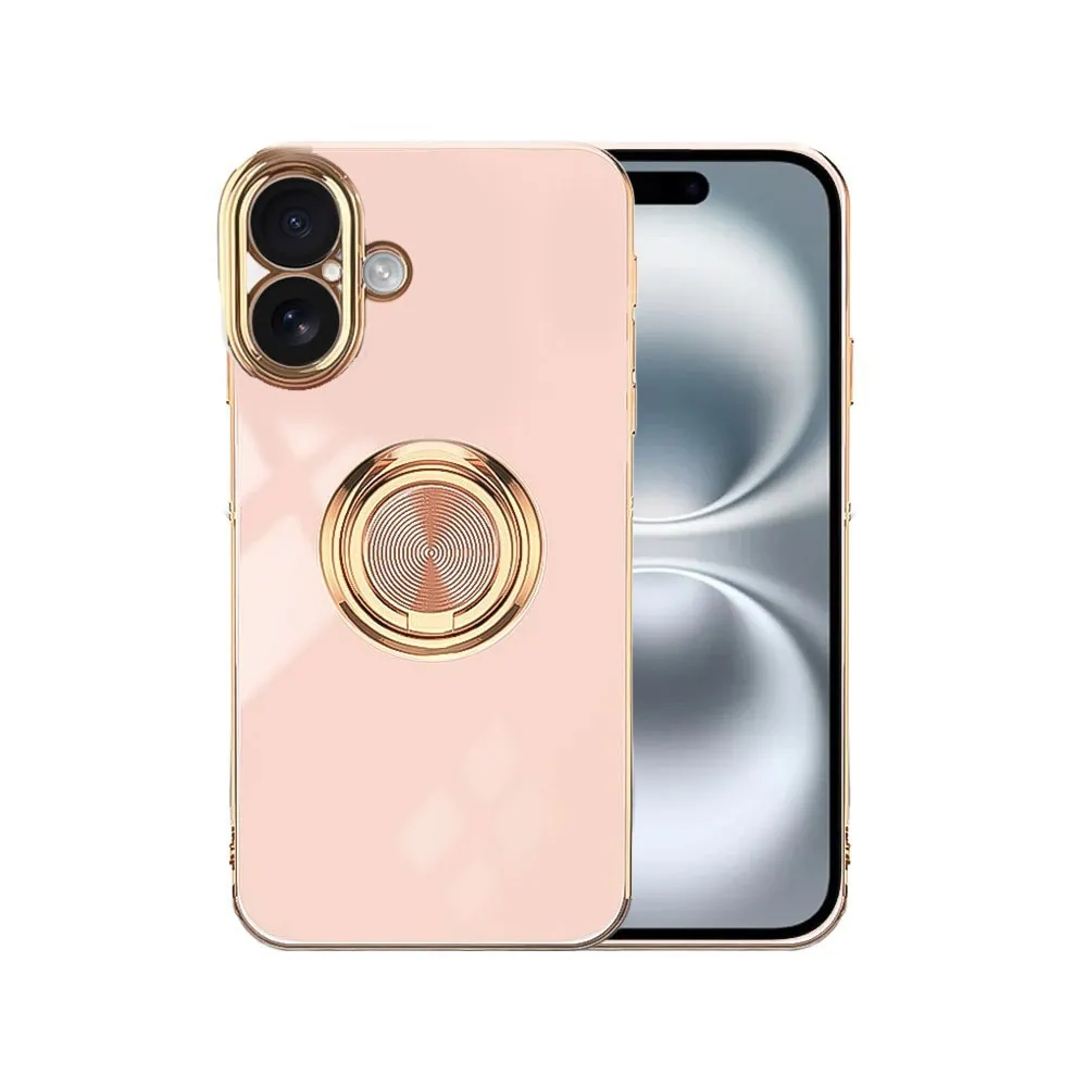 Etui do iPhone 16 eleganckie, ze złotym, metalowym uchwytem i zdobieniami, osłona na aparat, złoty róż