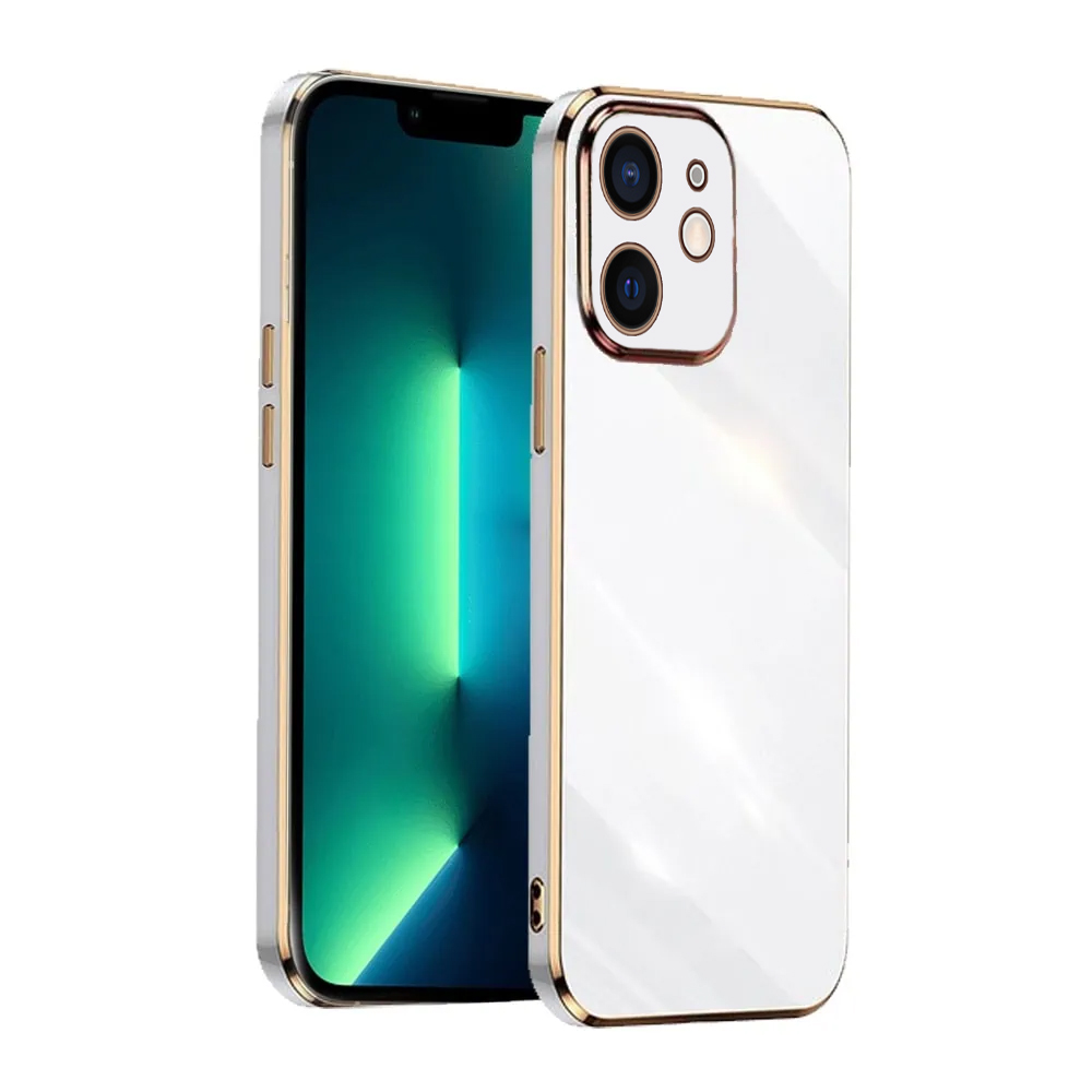 Etui do iPhone 12 luksusowe błyszczące ze złotą ramką i osłona na aparat, białe (OUTLET)