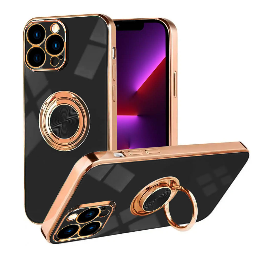 Etui do iPhone 13 Pro Max eleganckie, ze złotym, metalowym uchwytem i zdobieniami, osłona na aparat, czarne (OUTLET)