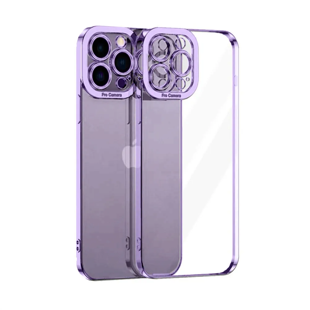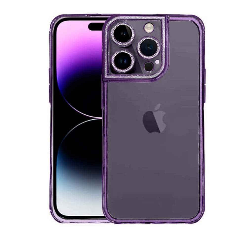 Etui do iPhone 14 Pro Max kryształowa struktura, osłona na aparat, przeźroczyste z purpurową ramką (OUTLET)