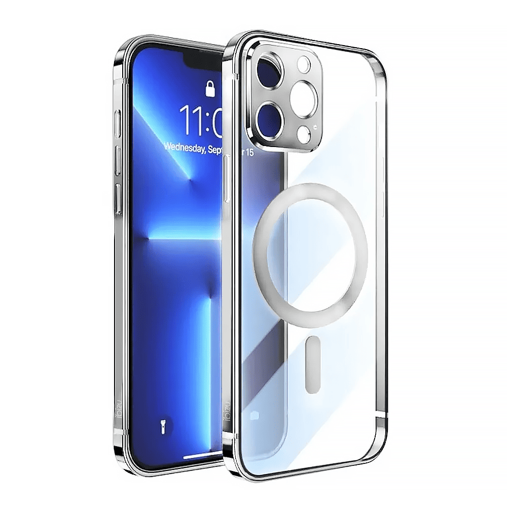 Etui do iPhone 14 Pro Max Ibizu Elite Skin, krystalicznie czyste z metalową ramką, srebrne z MagSafe (OUTLET)