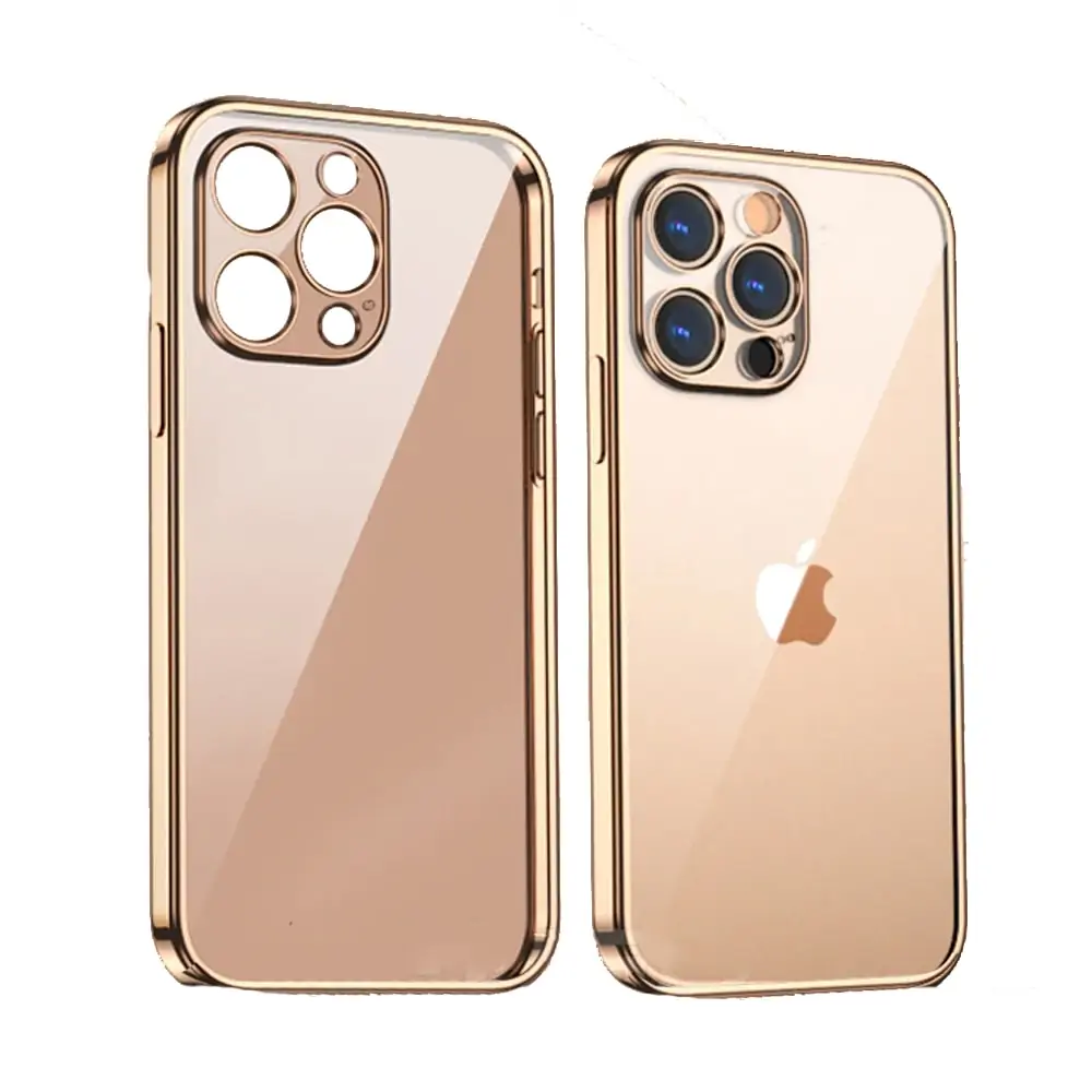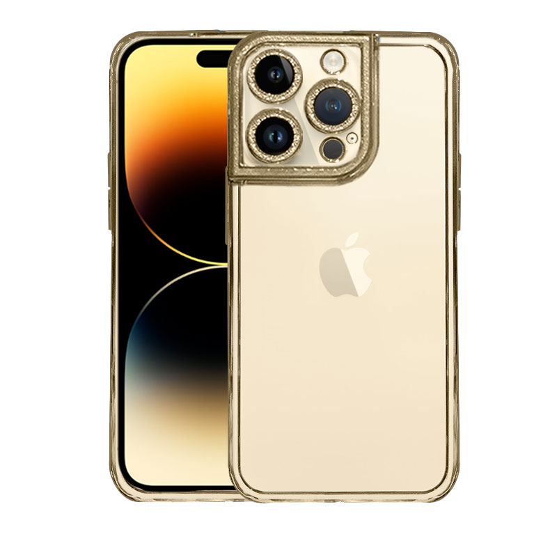 Etui do iPhone 14 Pro Max kryształowa struktura, osłona na aparat, przeźroczyste ze złotą ramką (OUTLET)