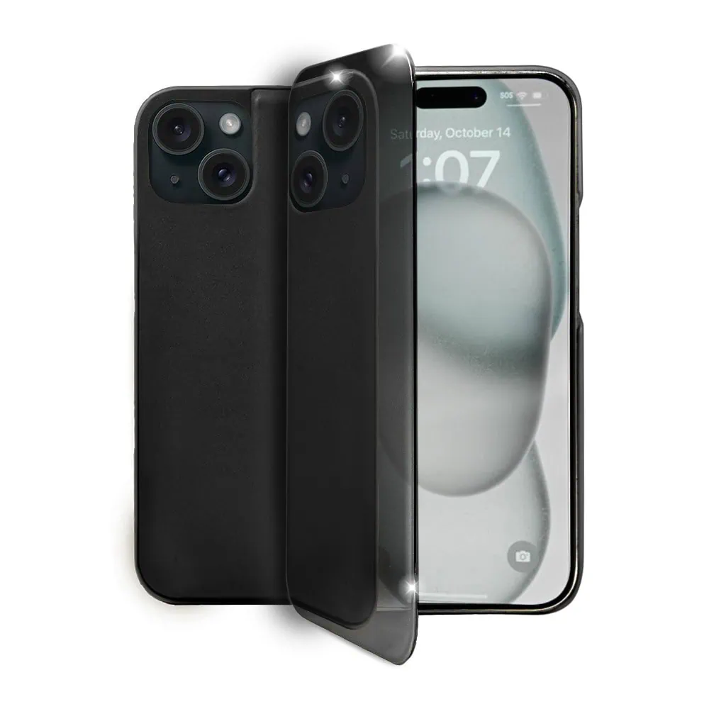Etui do iPhone 15 Plus Mirror View zamykane typu książka, eleganckie lustrzane, czarne (OUTLET)
