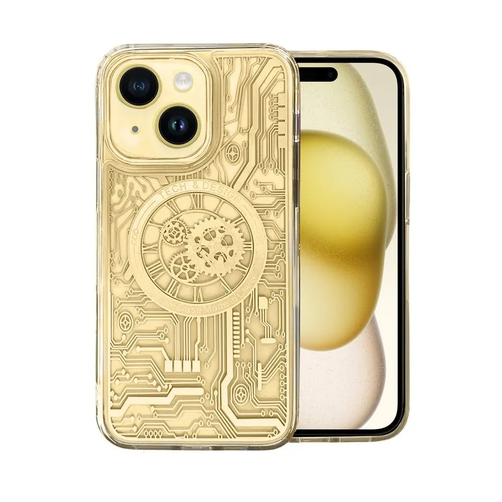 Etui do iPhone 15 Plus ClockWork MagSafe, przeźroczyste z mechanizmem w środku, złote (OUTLET)