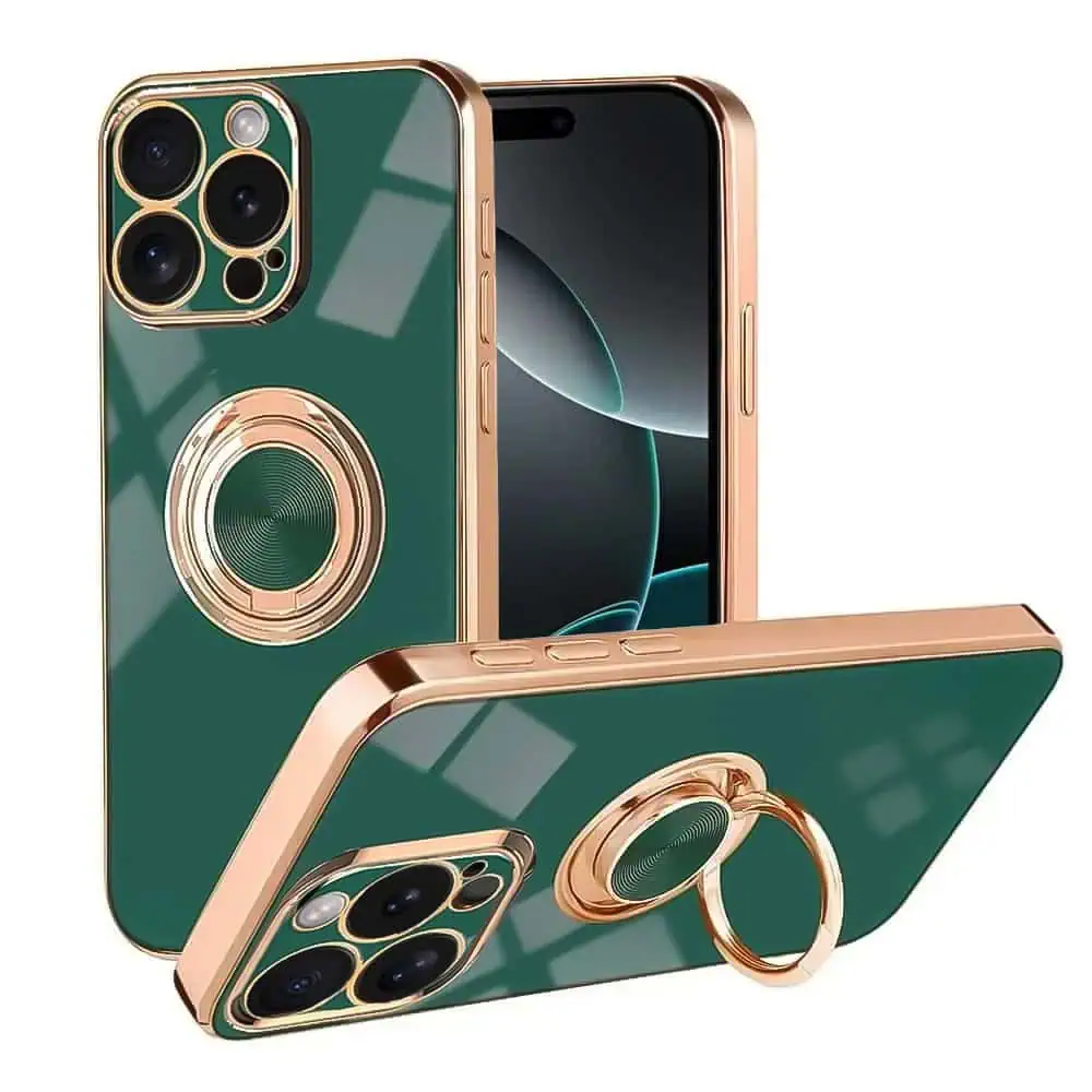 Etui do iPhone 16 Pro Max eleganckie, ze złotym, metalowym uchwytem i zdobieniami, osłona na aparat, zielone (OUTLET)