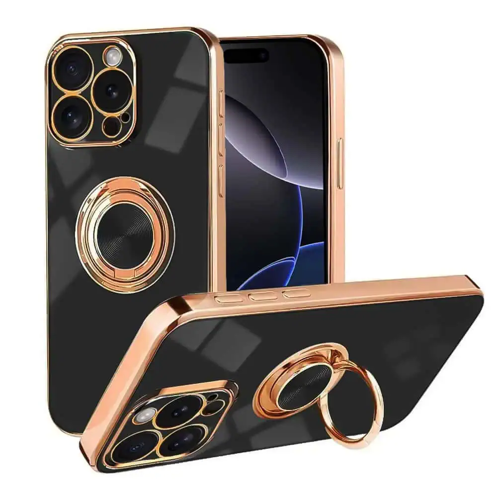Etui do iPhone 16 Pro Max eleganckie, ze złotym, metalowym uchwytem i zdobieniami, osłona na aparat, czarne (OUTLET)